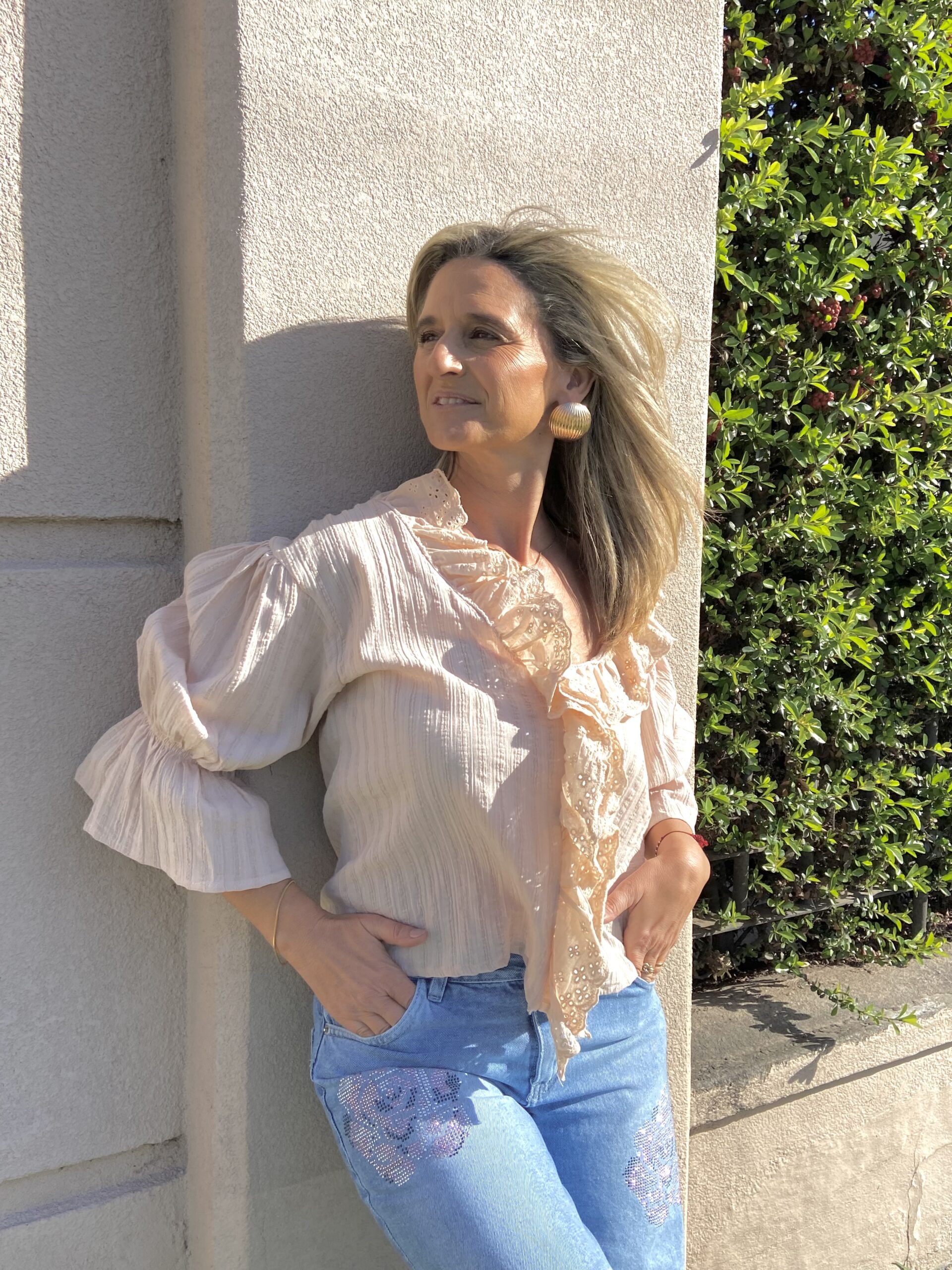 Blusa lino texturado y volados en broderie. Talle único que abarca un L